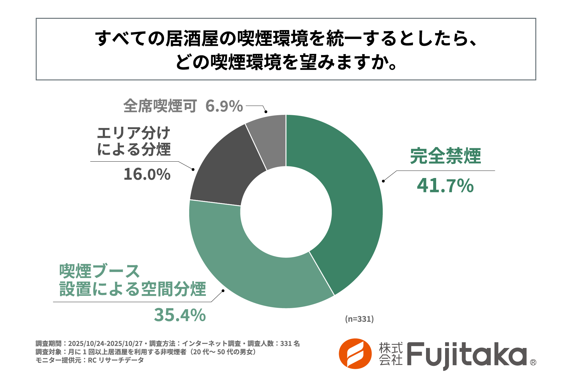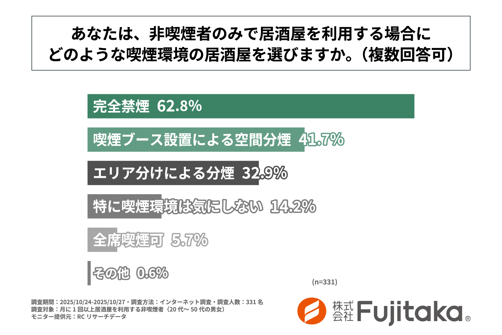 そこでこの度Fujitakaは、居酒屋の喫煙環境に対する非喫煙者の意識について調査を実施しました。居酒屋の喫煙環境が非喫煙者の意思決定に与える影響や、非喫煙者が求めている喫煙環境の実態を明らかにし、分煙対策を講じるためのヒントを提供することを目的としています。