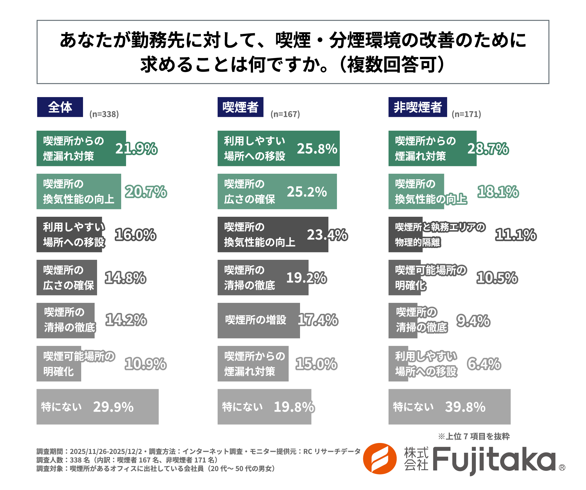 喫煙者の方からは「利用しやすい場所への移設(25.8%)」「喫煙所の広さの確保(25.2%)」と、喫煙スペースの利便性向上を求める回答が多く見られました。